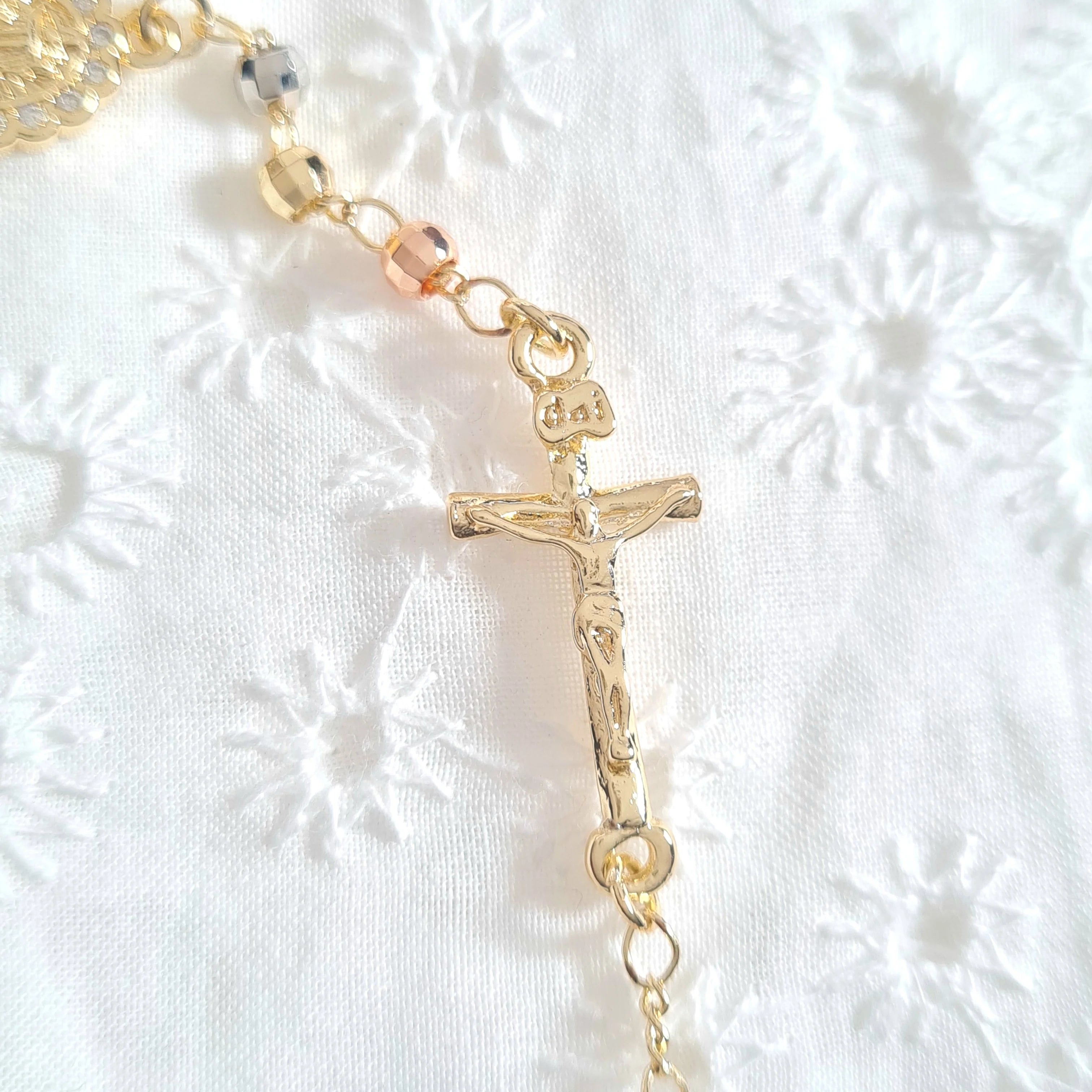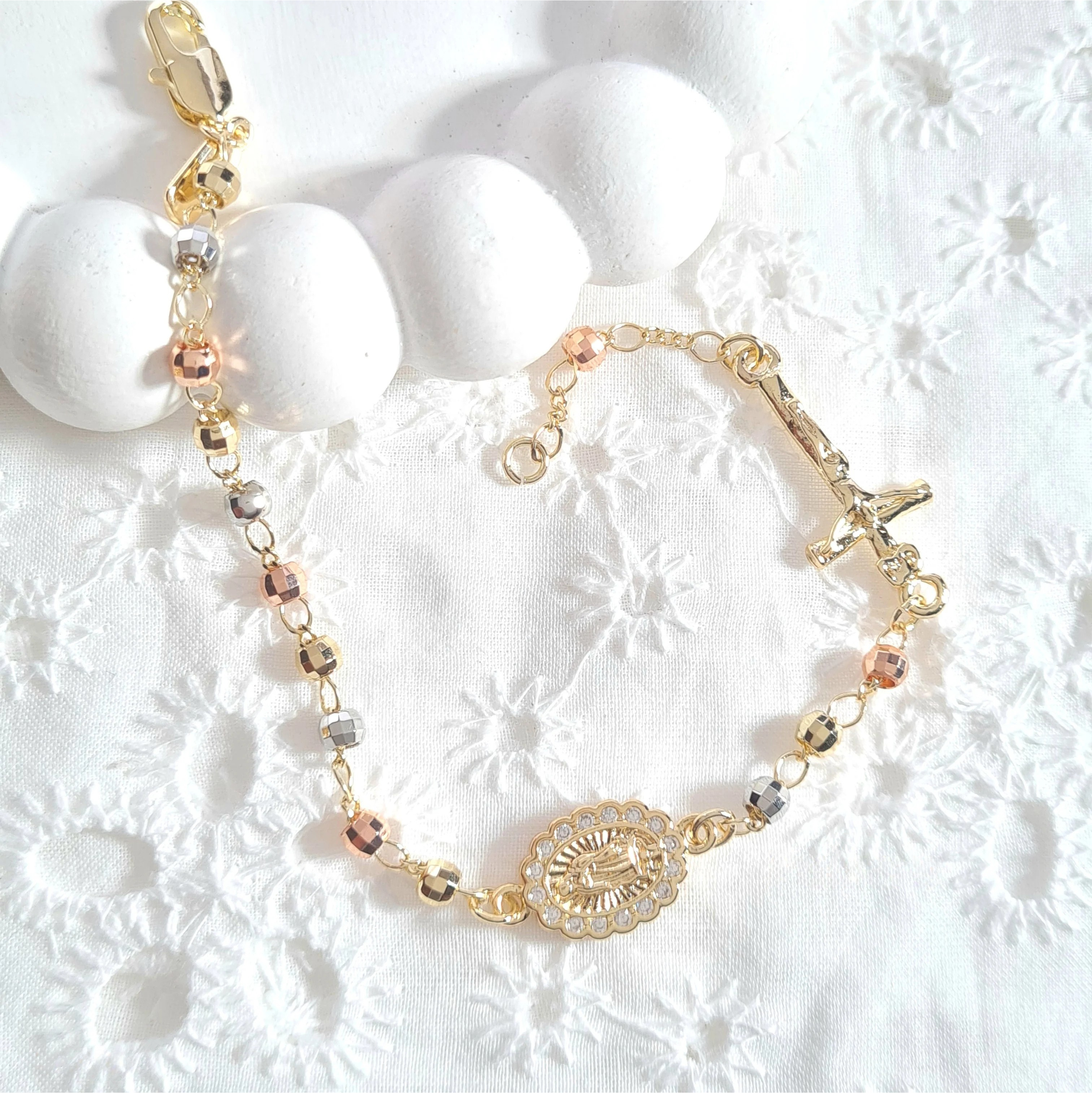 Designed with ten softly reflective beads and a petite crucifix, this bracelet becomes a prayer in motion, a miniature rosary meant to accompany you through each moment of the day. Mixed metallic tones shimmer gently with every movement, while the Our Lady of Guadalupe medal rests close, whispering her tender promise: “Am I not here, I who am your Mother?”