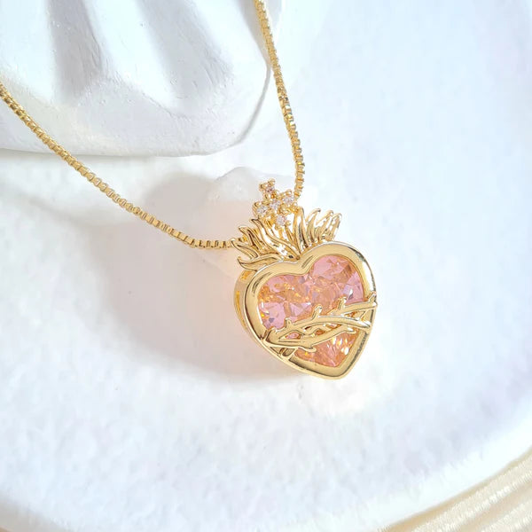 This necklace features a radiant pink heart-shaped gemstone wrapped in a crown of thorns, symbolizing Christ’s suffering for our redemption. The flame rising above recalls His burning and unending love.