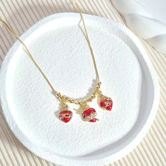 The Holy Family Hearts Necklace displays the traditional images of the Sacred Heart of Jesus, the Immaculate Heart of Mary, and the Chaste Heart of St. Joseph. These devotions developed over time in the Church as the faithful reflected on the roles of the Holy Family.